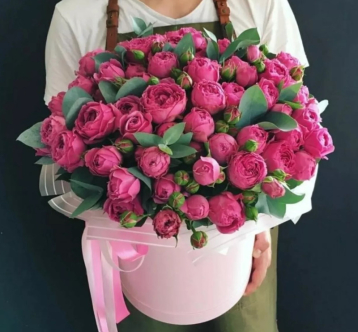 Коробка с красными розами и эвкалиптом